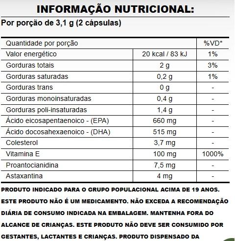Óleo de peixe com alto teor de EPA/DHA, D-alfa tocoferol, óleo de palmiste, proantocianidina (do cranberry em pó), ésteres de astaxantina de haematococcus pluvialis e lecitina de girassol. Composição da cápsula: gelatina, água purificada, glicerina e corante natural urucum.